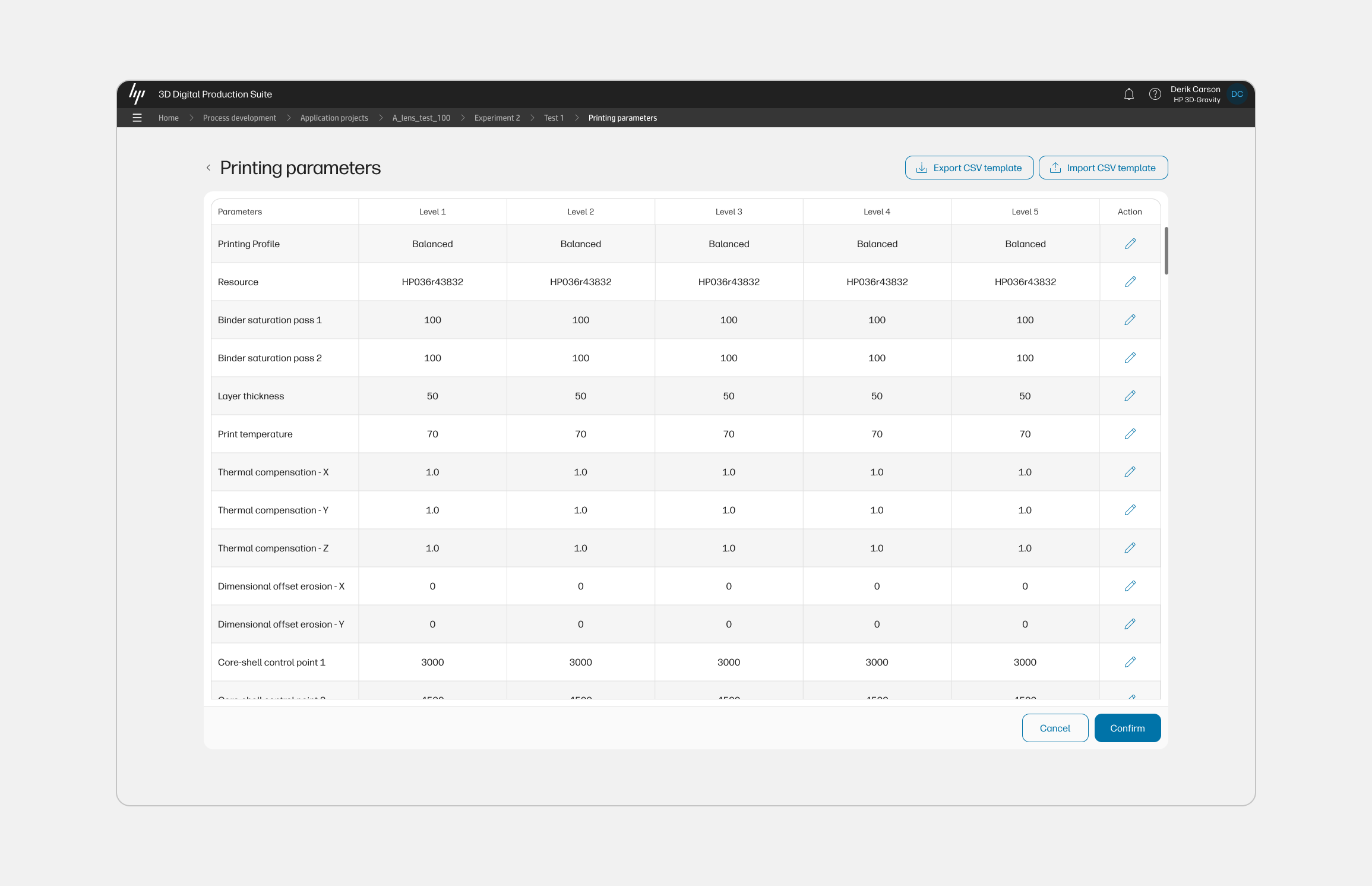 The full parameter matrix: printing profile, resource, binder saturation passes, layer thickness, print temperature, thermal compensation values, dimensional offset erosion, and core-shell control points, displayed per level in a single scrollable table. Rows are editable inline. Export and import CSV controls support batch workflows and cross-team collaboration. This is where the cross-level comparison that engineers were previously doing in spreadsheets becomes native to the tool. The table pattern emerged from a working session with the PM and engineering lead about what "comparison" actually meant in this workflow.